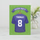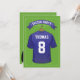 Convites de festa de aniversário com tema de futebol com fundo de campo de futebol verde, uma camisa esportiva azul com seu nome e número, uma bola de futebol e um modelo de festa moderno.