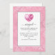 Convite de aniversário em forma de coração de gemstone cor-de-rosa com formato de coração, com um fundo damasco cor-de-rosa e uma elegante tipografia de escrita manual.