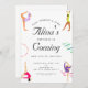 Este convite de aniversário de ginástica vibrante e ousada apresenta um fundo branco elegante, decorado com ícones coloridos de ginástica. Perfeito para pequenos ginastas ativos, ele captura a energia e o entusiasmo do esporte com um design divertido e atraente.