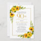 Cartão de aniversário de 90 floral amarelo bonito. Peônias amarelas e margaridas brancas se misturam com os girassóis. Um quadro retangular de ouro lhe dá uma vibração elegante. A Celebração de Aniversário do 90 e o nome do celebrante estão escritos em ouro. Muito fácil de personalizar. Essa parte de trás é branca com um buquê de girassol. Isto é perfeito para uma celebração de aniversário de verão.
