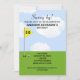 A festa de aniversário de golfe convida com a bandeira na via navegável. Editar texto para criar um convite de festas com tema de golfe.