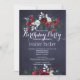 Modelo de convite floral para adultos, russo, e elegante, de inverno, com pedras aquáticas buquê em vermelho e branco e com ramos de abeto verde-pinheiro sazonal, bagos vermelhos e folhagem em fundo de quadro azul-marinho escuro à meia-noite.++++++++++++++ O convite é adequado para os elegantes festas de aniversário florais de inverno/Natal sazonal.
