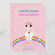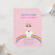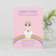 Cartão de convite de aniversário de gatinho bonito. O gatinho fofo está sobre um arco-íris em fundo rosa. Na parte de trás está uma estrela grande com o número cinco. O texto e o número estão prontos para serem personalizados para comemoração de aniversário de meninos ou meninas.