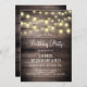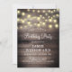 As luzes de cordas em um convite de aniversário de fundo de madeira de campo rústico, com tipografia de script e tipografia serif.