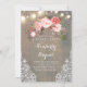 Convites de festas de aniversários russos / fazendas apresentam um incrível buquê floral rosa, uma corda de luzes, rendas e madeira.