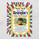 Adicione o convite para fotos das crianças de aniversário! Conselho brilhante e colorido de letreiro com borda de lâmpada falsa. Um convite divertido para o Carnaval para um tema do Big Top em vermelho, amarelo e azul lacrimogênio.