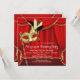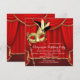 Convite de festa de aniversário de mascarada com uma bela máscara de penas de Mardi Gras dourada em um fundo de cortina vermelha e dourada. Este convite de festa de aniversário vermelho e dourado é facilmente personalizado para a sua festa ou evento, adicionando detalhes do evento, estilo de fonte, tamanho e cor da fonte e texto.