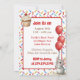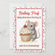Um convite de festa de aniversário de menina com um tema doce de ratinho e bolo de aniversário. Purpurina rosa, bege e vermelho cereja em um lindo bolo de baunilha sendo segurado por um ratinho aquarela!