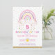 Convite de aniversário para meninas, com arco-íris desenhado à mão, nuvens coloridas e estrelas cintilantes.