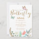 Convite de aniversário temático de borboletas bonitas com ilustração de borboletas com jardim floral de ouro falso. O texto no topo diz "Nossa Pequena Borboleta XX está virando XX." Perfeito para a festa de aniversário primavera de uma garota!