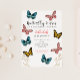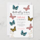 Convite de aniversário temático de borboletas bonitas com ilustração de borboletas coloridas com folhagem de ouro falsa no fundo. O texto no topo diz "Beijos borboletas e desejos de aniversário." Perfeito para a festa de aniversário branca de uma garota!