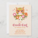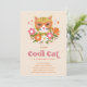 Este adorável convite de aniversário de meninas apresenta um gato retrô desenhado com a mão vestindo óculos de sol, junto com elementos florais e sotaques estelares. Uma paleta colorida de cor rosa, laranja, ouro mudado e verdes tonados de azeitona adiciona ao visual retrô/vintage! A parte traseira contém um padrão de tabuleiro de xadrez correspondente. * Ilustração e padrão de Tracey Khalei / Orabella Impressões.