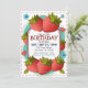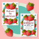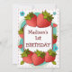 Comemore seu aniversário com estes convites de morango divertidos. No centro do convite estão modelos para adicionar todos os seus detalhes dentro uma caixa branca com uma borda de marrom escura. À volta da caixa de detalhes estão morangos vermelhos suculentos com folhas verdes. Também espalhadas por flores azuis bonitinhas e corações cor-de-rosa.