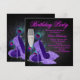Convite de festa de aniversário de número qualquer com elegantes penas de pavão rosa e roxo, salto alto com brilho roxo e champanhe. Você pode personalizar facilmente este lindo convite de festa de aniversário do pavão adicionando seus detalhes no estilo de fonte e cor, texto e layout de sua escolha.