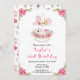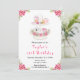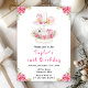Este convite de aniversário elegante e festivo apresenta uma banca de bolo com biscoitos de gengibre, macarões, doces, cacau quente e bule de chá. Nos cantos estão lindas flores rosa de poinsettia. O texto combina o script manuscrito e as fontes sans serif para uma aparência na moda e moderna. Isto é perfeito para um brunch de Natal ou uma festa de chá.