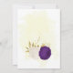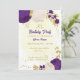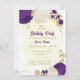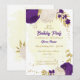 Romântica, roxo real e flores brancas com folhas de ouro, convite de aniversário botânico Os detalhes da brilha são simulados.