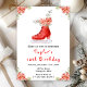 Este elegante e festivo convite de aniversário de aquarela apresenta uma bota vermelha de gelo e belas flores vermelhas florais de poinsettia. O texto combina o script manuscrito e as fontes sans serif para uma aparência na moda e moderna. Isto é perfeito para festas de aniversário de inverno e Natal.