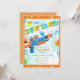 Meninos Summer Watergun Piscina Convite de aniversário com fundo de água colorido e uma arma de sopro. Adicione facilmente seus detalhes ao modelo. Veja como será o seu convite antes da compra.