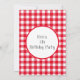 Xadrez vermelha e branca marcada com mais informações a serem adicionadas na parte traseira. Na frente está uma ilustração de uma pizza com todas as aparas. Excelente para uma comemoração de aniversário.