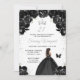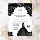 Este elegante e glamouroso convite de aniversário apresenta uma bela princesa com pele escura num vestido preto de bola. O texto combina o script manuscrito e as fontes sans serif modernas para um aspecto elegante e sofisticado. Os arranjos florais, borboleta e confete prateado criam a mistura perfeita de rústico e chic. Gráficos por www.etsy.com/uk/shop/SunflowerDayLove