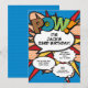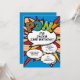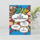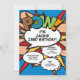 Um convite de aniversário inspirado em quadrinhos azul, divertido e moderno para qualquer idade que dá um toque de energia em qualquer celebração de aniversário de super-herói. O verso apresenta um padrão de bolinhas azul combinando que você pode substituir com sua própria imagem ou foto. Criado por Thisisnotme©