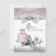 Convites de Quinceanera rosa e cinza com um belo bolo rosa e prata com números de diamante, sapatos de salto alto com glitter prateado e uma tiara elegante de diamante e prata sobre um fundo de redemoinho rosa e prata com laço de diamante. Você pode personalizar facilmente esses convites de Quinceanera princesa rosa e prata para o seu evento, simplesmente adicionando seus detalhes no estilo de letra e redação de sua escolha. Este é um design impresso sem glitter real, diamantes, laços, etc.