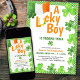 Um Convite de Aniversário do Garoto Sortudo com tema de Dia de São Patrício irlandês em verde e laranja. O convite é escrito com "A Lucky Boy" em tipografia química e decorado com ferradura e trevo de 4 folhas. A design apresenta uma estrutura verde de xadrez de gingham, de forma esbranquiçada, com shamrocks e quatro trevos de folha, a bandeira irlandesa e a ferradura de ouro. Se você quiser esta design para os produtos correspondentes, por favor, envie-me uma mensagem.
