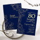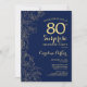 Convite de aniversário azul-marinho floral e 80-surpresa dourado. Design minimalista moderno com sotaques botânicos e letra de escrita tipográfica. Simples cartão de convite floral perfeito para uma festa surpresa na moda. Pode ser personalizado para qualquer idade.