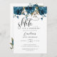 Cartão de convite de aniversário de surpresa floral com texto de roteiro que diz "shhh... é uma surpresa!" no topo com flores azuis marinhos.