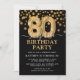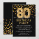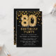 Convite de aniversário moderno de preto e ouro para alguém que faz oitenta anos! Apresentando um fundo preto, faux gold glitter confetti, balões de 80 de ouro e um elegante modelo de aniversário que é fácil de personalizar.
