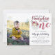 Convites de aniversário de outono adoráveis para o primeiro aniversário do seu pequeno(a) filho(a) apresentam "nossa pequena abóbora está fazendo um ano" com uma abóbora branca decorada com flores no lugar do "o". Um design fofo e rústico para belas celebrações de aniversário de outono, você pode personalizar com os detalhes da sua festa de aniversário abaixo. Adicione uma foto favorita da aniversariante para um toque pessoal fofo.
