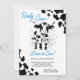 Convite de aniversário de bebê de vaca, preto e branco, do padrão das vacas brancas, brincalhão, convite para uma festa de aniversário com tema de fazenda, escrevendo azul para um aniversário de meninos.