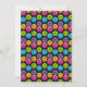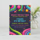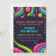 Um convite de aniversário vibrante e divertido com um design psicodélico inspirado no estilo retrô. O fundo escuro é decorado com formas coloridas e giratórias, linhas abstratas e gotas vibrantes de cor que lembram a década de 1970. A borda é um padrão divertido de rostos sorridentes multicoloridos, com estrelas e bolhas espalhadas por todo o design. O texto está em uma mistura de fontes negrito e divertidas, com detalhes importantes destacados em azul e rosa brilhantes.