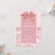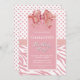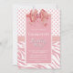 Um convite de aniversário cor-de-rosa e branco, que inclui um arco festivo, bolinhas e faixas de zebra enquanto o texto é enquadrado com uma falsa borda falsa.