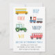 Um convite de aniversário de criança com trem, caminhão de bombeiros, trator e ônibus escolar.