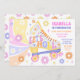 Um design de rolo brilhante e divertido inspirado na paleta colorida, cor-de-rosa, laranja, roxo e amarelo. Na frente está um skate de roleta branco com o texto 'Rolo de Vamos' em um script retrô com uma rajada de arco-íris atrás dele, e no verso está um padrão brilhante e divertido de flores retrorreflectoras. Personalize os detalhes do seu partido! Consulte a coleção de partes correspondentes.