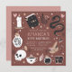 Planeje sua festa de aniversário de sorte, cigana, ou temática de Halloween com esses convites de chic assustadores em uma paleta de cores inspirada na natureza do boho. Design apresenta ilustrações de um cobra, espelho, vela, jarro, crânio, cartas de tarô e poção em torno dos detalhes da sua festa de aniversário.