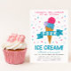 Cartão de convite de aniversário de criança, bonito e colorido, com ilustração desenhada à mão de um cone de waffle com três colheres de sorvete (rosa, azul e lavanda). Há aspersores por aí. O texto diz "Eu gritar, gritar, todos nós gritar 4 sorvetes!" Perfeito para a festa do 4º aniversário da criança no verão.