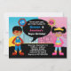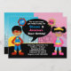 Personalize estes super-herói da criança cor-de-rosa e azul e convite de aniversário de Supergirl. Caracteriza uma arquitectura da cidade e um menino e uma menina ambos vestidos acima como um super-herói.