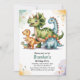 Este adorável design de convite de aniversário de dinossauros infantil tem cinco dinossauros aquosos realistas no centro. Estes dinossauros são verdes, azuis, amarelos e laranja. Eles estão cercados por uma borda de aquarela em roxo, verde e amarelo. Há espaço para adicionar o nome do seu filho, informações sobre a festa, informações de RSVP e muito mais. Aproveite!