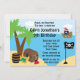 Este convite de aniversário bonito do pirata caracteriza a arca do tesouro de um pirata em uma praia.
