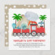 Um convite de aniversário de praça de dinossauros pré-histórico apresenta um fofo T-rex, Tricerátopo e Pterodátilo a montar um trem de aventura Jurássica com um fundo de palmeiras e um vulcão. O lado inverso são bolinhas brancas e faixas de dino em um fundo khaki. Estoque da KL original