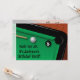 Este convite legal caracteriza uma mesa de bilhar com vara de piscina, bola de sugestão, e bola 8, com texto customizável. A parte traseira caracteriza a mesma imagem, com duas camadas transparentes, e o texto informativo customizável.