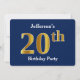 Este design de convite apresenta o número ordinal "20" com uma aparência falsa em forma de ouro. Também apresenta um nome personalizado e um fundo azul. Poderia ser usado para convidar pessoas para a vigésima festa de aniversário de alguém.