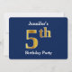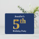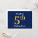 Este design de convite apresenta o número ordinal "5" com uma aparência falsa em forma de ouro. Ele também apresenta um nome personalizado e um plano de fundo azul. Poderia ser usado para convidar pessoas para a quinta festa de aniversário de alguém.