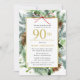 Convite de aniversário floral botânico Elegante para o inverno para uma Celebração de Aniversário de 90 em dezembro, Janeiro ou fevereiro. Galhos de pinheiros verdes escuros misturam-se com folhas e vinhas de eucalipto verde-claro. Pinhas marrons adicionam textura e profundidade. Uma estrutura retangular de ouro lhe dá uma elegante vibração rústica. A Celebração de Aniversário do 90 e o nome do celebrante estão escritos em ouro. Um arco vermelho moderno e minimalista é colocado no topo da estrutura dourada para um toque festivo. Muito fácil de personalizar. Aquela parte de trás é muito verde. Isto é perfeito para um homem ou uma mulher.