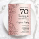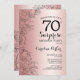 Convite de aniversário rosa Dourado Surprise 70. Design Glam feminina com folha de ouro rosa, sotaque botânico e letra de escrita tipográfica. Simples cartão de convite floral perfeito para uma festa surpresa na moda. Pode ser personalizado para qualquer idade. Impressos convites Zazzle ou modelo de impressão digital instantânea para download.