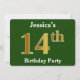 Este design de convite apresenta o número ordinal "14" com uma aparência falsa em forma de ouro. Também apresenta um nome personalizado e um fundo de cor verde. Os detalhes do evento no verso podem ser personalizados. Poderia ser usado para convidar pessoas para a décima quarta festa de aniversário de alguém. [~Z0000013]