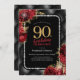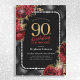 Convite de aniversário de 90 vermelho Dourado Elegante. Este design apresenta uma elegante mistura de preto, ouro e vermelho com um sofisticado motivo floral. O pano de fundo é um preto luxuoso, que contrasta lindamente com o intrincado ouro e o tom floral vermelho que enquadra as bordas. Utiliza-se ouro elegante e tipografia vermelha, acrescentando um toque de opulência e refinamento. A combinação harmoniosa dessas cores e o delicado design floral cria um sentimento convidativo e comemorativo, perfeito para marcar um aniversário marcante.