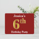 Este design de convite apresenta o número ordinal "6" com uma aparência falsa em forma de ouro. Também apresenta um nome personalizado e um fundo vermelho. Os detalhes do evento no verso podem ser personalizados. Poderia ser usado para convidar pessoas para a sexta festa de aniversário de alguém. [~Z0000012]